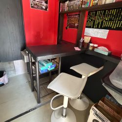 店内は赤.黒基調で狭小な、今日現在下に棚のある厨房向きL字カウンター4席と壁向きカウンター1席、4人掛けテーブル席が2卓ありお水は卓上のピッチャーにてセルフ(奥正面にお手洗いあり)。